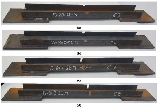 The shape of the second group with damage in two legs in the middle of the element’s length: (a) D-20%-2L-M; (b) D-40%-2L-M; (c) D-60%-2L-M; (d) D-80%-2L-M.