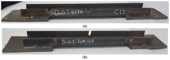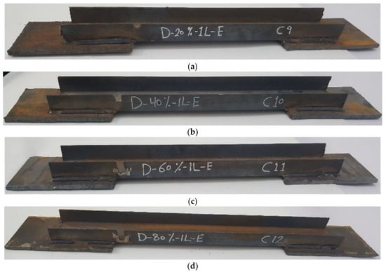 The experimental program comprised a control specimen without damage and 14 specimens with damage in the unconnected channel legs. The specimens with damage were divided into four groups as follows: The first group had damage in one unconnected channel. The damaged area was in the middle, with damage ratios of 20%, 40%, 60%, and 80%, as shown in Figure 3. For the second group, the damage was in both the unconnected channel legs, with the same ratios of damage as in the first group, as can be seen in Figure 4. The specimens in the third group had the damage in only one unconnected channel leg at the end of the element’s length, as shown in Figure 5. The specimens of the fourth group had 60% damage in one leg only at the cross-section. However, there were two damaged sections, one was in the middle and the other one was at the end of the element’s length. Furthermore, one of the specimens had damage in the same unconnected leg on one side, and the other specimen had damage on two different sides, as shown in Figure 6. This damage had a rectangular shape with a depth that was equal to the required damage ratio and a fixed width that was equal to 10 mm, which was achieved through the use of an electric cutter. Three conditions must be taken into account when one is producing damage. Firstly, the damage should originate on the free end of the unconnected channel leg. Secondly, the direction of the damage should be perpendicular to the direction of the length of the element. Thirdly, if there is damage in more than one location, they must have the same ratio. The specimens were named, and some names were shortened to symbols, for example, D-20%-1L-M, D-20%-2L-M, and D-20%-1L-E, where, D = damage, 20% = the damage rate is 20% of the depth of the unconnected channel leg, 1L = damage to one leg of the channel, M = damage to the middle of the element’s length, 2L = damage to two legs of the channel, and E = damage to the end of the element’s length.