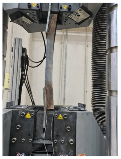Fifteen steel channel UPN specimens were tested using a tensile loading machine (Civil Engineering Department Lab, King Saud University, Riyadh, Saudi Arabia) with a capacity of 1000 kN, as presented in Figure 7. The testing machine had a fixed upper jaw and a mobile lower jaw. Tensile tests were conducted for each specimen at a tensile load rate of 5.0 kN/min for all of the specimens. A computer-aided data acquisition system was employed for monitoring the loads and displacements.