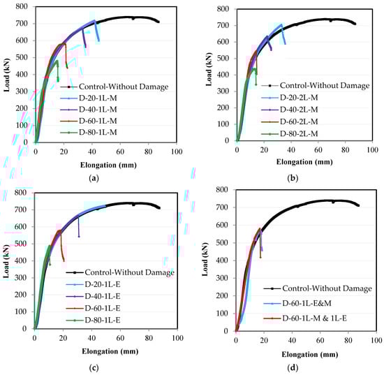 Experimental test results of load-elongation relationships: (a) damage in the middle of the length in one leg; (b) damage in the middle of the length in two legs; (c) damage at the end of the length in one leg; (d) damage at the end and middle of the length in one leg.