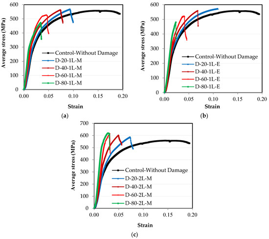 Experimental average stress–strain engineering relationships: (a) damage in the middle of the length in one leg; (b) damage at the end of the length in one leg; (c) damage in the middle of the length in two legs.