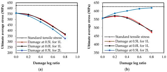 The relationship between the average ultimate stress and the damage ratio in the unconnected leg. (a) Stresses on the original section; (b) stresses on the damage section.