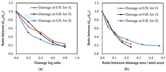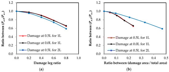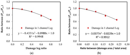 The relationship between the ultimate load ratio and the damage ratio in the unconnected leg. (a) Damage ratio from leg depth; (b) damage ratio from the cross-sectional area.