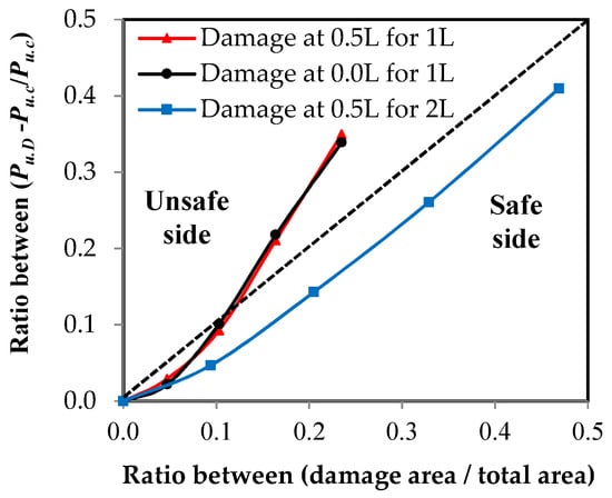 Using the relationship between the load and the elongation, which were measured using the testing machine for all of the specimens, the relationship between the load ratio of the damaged elements to the control element and the damage ratio in the unconnected leg is represented in Figure 13. These relationships were affected by two factors: the damage ratio in the unconnected leg related to the total depth and the location of the damage in relation to the length of the element. The damage ratio is represented in two ways as follows: Figure 13a shows the representation of damage as a ratio of the depth of the unconnected leg and Figure 13b represents the damage as a ratio of the cross-sectional area of the element. In terms of the type of channel UPN, it was found that the thickness of the unconnected leg was not fixed over the entire depth, so the reduction of the area of the cross-section was irregular according to the ratio of damage in the depth. As shown in Figure 13, as the value of the damage increases, the maximum capacity of the axial load of the steel channel element decreases. When the damage ratio in one unconnected leg is 80%, the reduction of the carrying capacity reaches 65% and 66% of the total load of the non-damaged element when the damage is in the middle or at the end of the steel element’s length, respectively. However, when the damage in the two unconnected channel legs is 80%, the reduction reaches 59%. From the shape of the curves, it was found that the value of reduction at the beginning of the damage is small, and as the damage ratio increases, the percentage of reduction becomes large. The relationships between the effect of the reduction of the damaged cross-sectional area and the percentage of the reduction of the maximum load capacity are presented in Figure 14. A 45 degree inclined line has been drawn, which is a line separating the safe or unsafe sides with a reduced ratio in the maximum axial load capacity for the damaged steel channel sections (Figure 14). It was observed that when there is damage in the two unconnected legs, the reduction of the load ratio is smaller than that in the cross-sectional area, so all of the cases are on the safe side of the design. When the percentage of damage in the two unconnected legs reaches 80% of the depth, which is equivalent to 46.9% of the cross-sectional area, the reduction of the percentage of load reaches 41%. When the damage happens to one leg only, whether this damage is in the middle or at the end of the element’s length or the damage ratio is up to or equal to 40% of the depth of the unconnected channel leg, which is equivalent to a damage rate of 10.30% of the cross-sectional area, the reduction of the load ratio is less than that in the cross-sectional area, which is, on the safe side of the design. However, when the damage ratio exceeds these values, the reduction ratio in the load begins to increase and it moves to the unsafe side of the design. When the percentage of damage reaches 80% of the depth of the unconnected leg, which is equivalent to 23.5% of the cross-sectional area, the reduction of the percentage of load for the damaged elements in the middle or at the end of its length reaches 35% and 33.9%, respectively. This is due to the presence of stress concentration at the corner of contact of the damaged leg with the web of the steel channel section, which accelerates the failure of the element at a load of less than the equivalent load for the actual cross-sectional area. Therefore, this deficiency must be considered when one is designing steel elements that may contain damage to one unconnected leg in that are ratios greater than 40%.