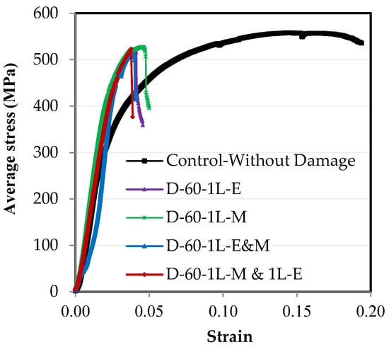 From the relationship between the load and elongation, which were measured using the test machine, the engineering stress–strain relationships were obtained by dividing the load on the cross-sectional area to obtain the stress and dividing the elongation on the length of the element to obtain the strain, as shown in Figure 9. Over the length of the steel element, there are two stress values according to the location of the cross-section, where there is stress on the original section without damage, and there is another stress on the damaged section, where the area of the section decreases due to the damage. The relationship between the engineering stress and strain over the entire element’s length except for the damaged section is the same as that between the load and elongation, as shown in Figure 8. Meanwhile, the engineering stress–strain relationship at the damaged section varies according to the ratio of damage, as presented in Figure 9. For all of the specimens that were subjected to damage, as the damage ratio increases in the unconnected channel leg, the strain on the entire length of the steel channel element decreases, whether the damage is in one leg or both legs or in the middle of the element’s length or at the end (Figure 9).