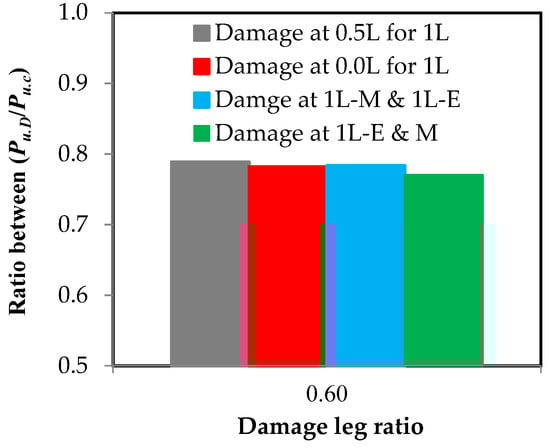 From Figure 16 and Figure 17, it is clear that the damage location in relation to the length has a weak effect on the properties of the steel element. In Figure 16, it was found that when there is damage at 60% of the depth of the steel channel element that is not connected, the relationship between the stress and the strain is very close despite the damage being in the middle or at the end of the element’s length or in the middle and at the end together. Additionally, in Figure 17 which shows the effect of the damage location on the maximum load capacity of the steel channel element, it was found that the maximum difference between the load reduction ratios where the damage is in the middle or at the end or both together on one or two different sides is 1.9%. This result is fully consistent with the study conducted by Sayed [] who examined the damage in the single unconnected angle leg at three locations along 0.0, 25%, and 50% of the element’s length, with a maximum difference being between the percentages of load loss of 2.0%. This completely agrees with the result in the current research.