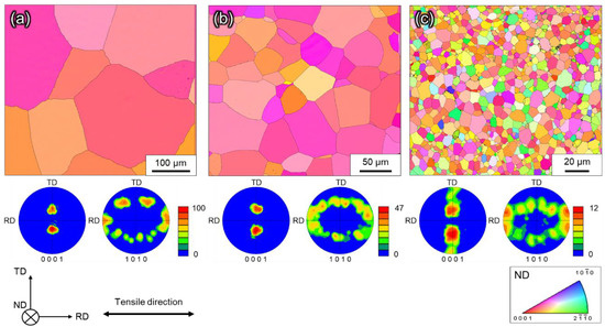 Secondary electron (SE) images were obtained by SEM (ULTRA 55, Carl-Zeiss AG, Oberkochen, Germany; Scios, Thermo-Fisher-Scientific Inc., Waltham, MA, USA) to observe the microstructure. EBSD was used to analyze the crystal orientation. EBSD data were acquired using an OIM system (Ametek Inc, Berwyn, PA, USA). The acceleration voltage was 15 kV, and the step size was varied from 0.1 to 1 µm depending on the grain size. The specimens used for observation were wet-polished with emery paper (from #80 to #3000). This was followed by electropolishing in an electrolytic solution of methanol:perchloric acid = 95:5 (volume ratio) under the conditions of a voltage of 10 V, temperature of −40 °C, and current of 0.5 A.