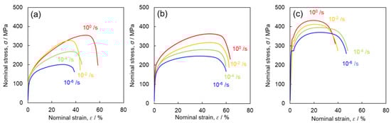 Nominal stress-nominal strain curves of (a) Ti-210, (b) Ti-30, and (c) Ti-5 obtained from tensile tests performed at room temperature at strain rates ranging from 10−6 to 100 s−1.