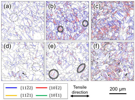 GB maps of Ti-30 after deformation. Interrupted specimens at (a) 6%, (b) 16%, and (c) 30% strain in high strain rates, and (d) 8%, (e) 14%, and (f) 30% strain in low strain rates. The areas circled in white in (b,e) were confirmed by twins.