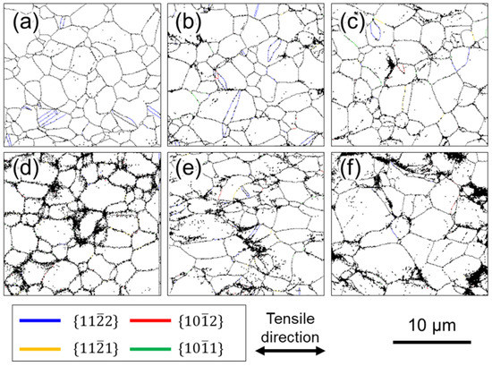 Figure 4, Figure 5 and Figure 6 show the grain boundary maps (GB maps) after tensile testing at 100 s−1 and 10−6 s−1. Figure 4 shows Ti-210 specimens interrupted at (a) 12%, (b) 14%, and (c) 22% strain at high strain rates, and (d) 10%, (e) 14%, and (f) 18% strain at low strain rates. Figure 5 shows Ti-30 specimens interrupted at (a) 6%, (b) 16%, and (c) 30% strain at high strain rates, and (d) 8%, (e) 14%, and (f) 30% strain at low strain rates. Figure 6 shows Ti-5 specimens interrupted at (a) 7%, (b) 14%, and (c) 24% strain at high strain rates, and (d) 8%, (e) 14%, and (f) 24% strain at low strain rates. In all the figures, the left and right directions on the paper correspond to the tensile direction during tensile testing. In the GB maps, the random high-angle (defined as 15° or greater) grain boundaries are shown in black, and the grain boundaries classified as the , , , and twin boundaries are shown in red, blue, green, and yellow, respectively. For the twin boundaries, the tolerance angle from the ideal value of the K1 plane and orientation difference was set to between 10° and 15°. Normally, the ideal tolerance angle for a twin boundary is 5°. However, the tolerance angle of 5° misses the twin boundary because the actual crystal orientation relationship between parent and twin phases changes due to deformation. Therefore, the tolerance angle in this study was set to a higher value. Figure 4 and Figure 5 show that twinning occurred in the grains of Ti-210 and Ti-30 at both high (100 s−1) and low strain rates (10−6 s−1), and the frequency of twinning increased as the deformation progressed. The twins are lens-shaped: thicker at the center and thinner toward the tip. At both deformation rates, twins preferentially formed at low strains. As the deformation progressed, twins formed more frequently. The twins occurred homogenously in grains of any orientation. In contrast, twins were generally a result of secondary twinning inside the twins, as observed in the grains circled by a solid white line in Figure 5b,e. As shown in Figure 2, this specimen has a TD-split texture with [0001] tilted by approximately ±35° from the ND to the TD. When twinning—wherein the c axis rotates by approximately 64°—occurs in some grains having such a texture, the c axis inside the twins becomes almost parallel to the tensile direction. Consequently, inside such twins, twins with tensile twinning properties are likely to form as secondary twins during subsequent deformation. The order of occurrence of such twinning deformation has been reported for CP-Ti under tensile deformation [7,21] and is opposite to that reported for compressive deformation [12,24]. In this study, the occurrence of twins was minimal under all deformation conditions for every sample, and no twins were observed. The and twins mostly occurred at the grain boundaries, and twins of the same type formed in multiple parallel layers within a grain. Tsukamoto et al. [8] reported that these twins occur at grain boundaries during room-temperature deformation. The introduction of these twins indicates that the grain size gradually becomes finer with increasing deformation. Notably, at similar strains, both and twins occurred more frequently at high strain rates (100 s−1) than at low strain rates (10−6 s−1). Therefore, at high strain rates (100 s−1), the grain refinement associated with twinning is significantly enhanced.