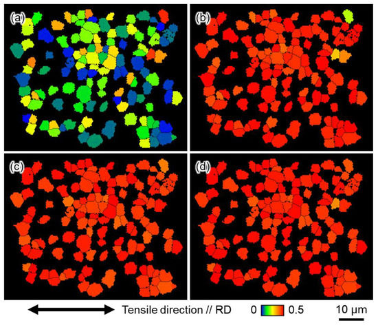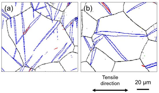 In addition, it is important to focus on the shape of the twins. Figure 7a,b show expanded views of the GB map in the grains circled by the black dashed lines in Figure 5a,d, respectively. At high strain rates (100 s−1) (Figure 7a), the aspect ratio of the twins is large, whereas at low strain rates (10−6 s−1) (Figure 7b), the twins are rather thick in the width direction. The average value of the aspect ratio for the twins observed in the entire field of view of Figure 5a,d were 8.9 and 5.9, respectively, indicating that thin twins are more likely to be generated under deformation at high strain rates. Thus, it can be concluded that a large number of thin twins tend to be generated at high strain rates (100 s−1) and that the thin twins more effectively subdivided the crystal grains during deformation.