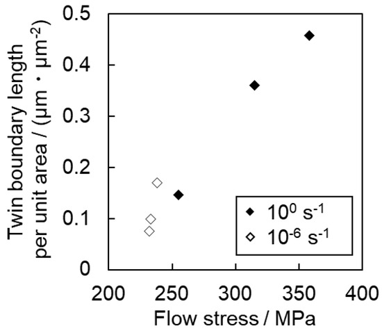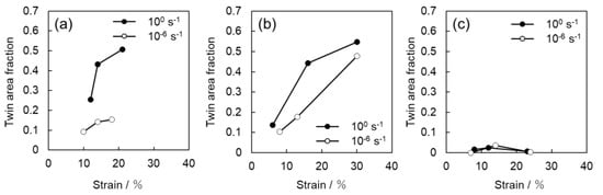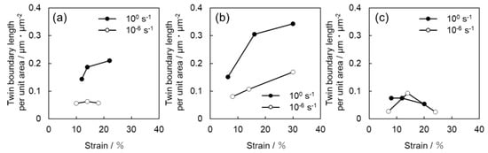 In Figure 9, the twinning area fraction also shows the same tendency as that observed in Figure 8. While the twin boundary length per unit area of Ti-30 is higher than that of Ti-210, the twin area fraction of Ti-210 is slightly higher than that of Ti-30. These results suggest that the number density of twins in Ti-210 is smaller than that in Ti-30, but each twin is thicker. On the other hand, in Ti-5, the frequency of twinning is low at both high (100 s−1) and low (10−6 s−1) strain rates.