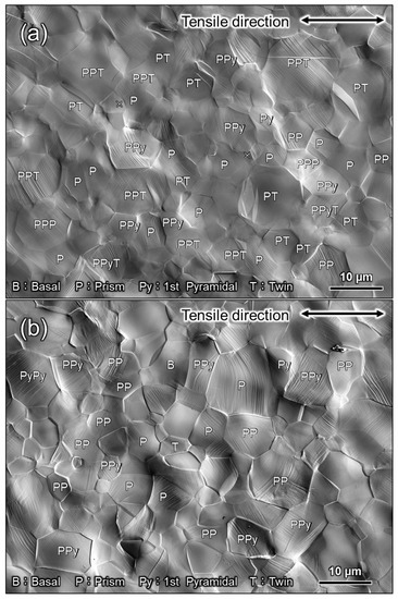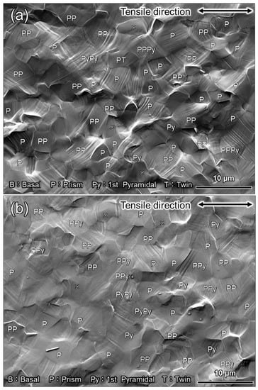 SEM images of Ti-5 after deformation by (a) approximately 18% plastic strain at high strain rates (100 s−1) and (b) approximately 14% plastic strain at low strain rates (10−6 s−1). B, P, Py, and T indicate that the basal slip, prism slip, 1st order pyramidal slip, and twinning, respectively.