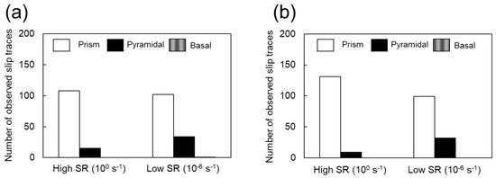 In CP-Ti, prismatic dislocation slip is the principal slip system at room temperature. However, this alone is not sufficient for plastic deformation to proceed to an arbitrary shape: either the slip system that includes the c-component, or the twinning, or both must be active concurrently with the principal slip. In other words, to discuss the occurrence of twinning, an understanding of the dislocation motion that is concurrently active is necessary. For example, the increased frequency of twinning at cryogenic temperatures is attributed to the temperature dependence of the CRSS of the dislocation slip [25,26]. In a study that used crystal plasticity finite element analysis to investigate the effect of strain rates on the CRSS of dislocation slip, Rodríguez-Galan et al. [27] showed that CRSS increases with higher strain rates in nanostructured pure titanium. However, there are few reports on the dependence of CRSS on strain rate in pure titanium with normal grain size. Table 3 shows the strain rate sensitivities of and . Dislocation motion and twinning are synergistically involved in . In contrast, should be strongly related to the CRSS of the main slip, i.e., the prism dislocation slip. In other words, the strain-rate dependence of indicates that the CRSS of the prism dislocation slip is strain-rate-dependent. Hence, the increased CRSS of this dislocation slip can be considered as a factor that contributes to the increased frequency of twinning at higher strain rates. Next, we consider the contribution of dislocation motion other than that of the prism slip. As shown in Figure 8 and Figure 9, the frequency of twinning increases with increasing strain. In titanium, as deformation progresses, dislocation activities other than prism slip may occur, and these activities may affect the frequency of twinning. Figure 10 shows SEM-SE images of Ti-30 deformed up to approximately 15% at high (100 s−1) and low (10−6 s−1) strain rates. Figure 11 shows the SEM-SE images of Ti-5 deformed up to approximately 18% at high strain rates (100 s−1) and 14% at low strain rates (10−6 s−1). In both Figure 10 and Figure 11, slip lines that correspond to active dislocation slips in each grain can be clearly observed. By focusing on the slip lines, it is possible to distinguish grains with a single slip from grains with multiple slips. The following procedure was used for slip line trace analysis [28]: EBSD measurements were performed in the same field of view as the SE image in Figure 10 and Figure 11. For the grains with clearly visible slip lines in the SE image, each slip plane was drawn using the slip plane notation function in the OIM system. The slip plane is represented by a single or multiple intersecting lines, with one line for the basal plane, three lines for the prismatic plane, and six lines for the pyramidal plane. Comparing slip lines on the SE image and slip plane traces drawn by the OIM system, the one that is parallel is the slip plane of the active slip system. Slip line tracing analysis was performed on 80 and 100 grains for each condition for Ti-30 and Ti-5, respectively. The corresponding symbols are shown in the figure, where P indicates the prism slip, B indicates the basal slip, and Py indicates the 1st order pyramidal slip. Multiple symbols indicate the occurrence of multiple slips. T indicates twinning and cross marks indicate that the slip line could not be confirmed on SE images. The 1st order pyramidal slip is active in both dislocation slip and dislocation slip but slip line tracing analysis cannot distinguish between the two. A comparison of the number of slip systems observed in Figure 10 and Figure 11 is shown in Figure 12. In the case where multiple traces of prism slip are observed in a grain, e.g., PP in Figure 10, the number of P is counted as two. At both high (100 s−1) and low (10−6 s−1) strain rates, prism slip was the dominant dislocation slip. The activity of the basal slips was negligible. Figure 13 shows the Schmid factor (SF) maps of (a) basal, (b) prism, (c) pyramidal , and (d) pyramidal slips for Ti-5. The observation area of Figure 13 matches that of Figure 11b, and the grains extracted are the those with traced slip planes in Figure 11b. The SF maps show that the SFs are high for prism, pyramidal , and pyramidal slips in most grains, but low for basal slips. This tendency is well explained by the fact that little basal slip activity is observed in Figure 12.