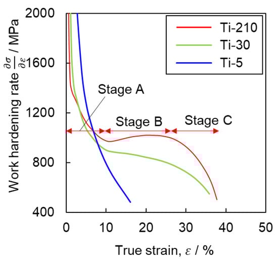 Figure 14 shows the relationship between the length of the twin boundary per unit area and the flow stress at the interruption of tensile testing in Ti-30. There is a clear positive correlation between twin boundary length and flow stress. Tsukamoto et al. [32] reported that grain refinement by the introduction of twins is effective in increasing dislocation density, which leads to excellent work-hardening. Accordingly, Figure 15 shows a comparison of the work-hardening rate of each sample during deformation at high strain rates (100 s−1), which was the strain rate that showed the best work-hardening result in this study. Ti-5 exhibits the general behavior of a decreasing work-hardening rate with increasing strain. In contrast, for Ti-210 and Ti-30, the variation in work-hardening rate followed a specific S-shaped curve. Similar trends were reported by Salem et al. [2,33] and Ahn et al. [17]. Similar to the results of Salem et al. [2,33], the S-shaped curve herein is classified into stages A, B, and C, as shown in Figure 15. Stage A corresponds to the region where the work-hardening rate decreases owing to the dynamic recovery of the dislocations. Stage B corresponds to the introduction of twins. This is evident from the fact that Stage B does not exist in Ti-5, wherein the frequency of twinning is lower. In Stage C, crystal refinement progresses owing to the occurrence of deformation twinning, and the occurrence of twins saturates. Thus, the dynamic recovery of dislocations alone contributes to the work-hardening rate. Ti-210 shows a higher work-hardening rate at the same strain compared with Ti-30, reaching a maximum value during Stage B. Additionally, from Figure 3, discontinuous yielding is observed in Ti-5. This is often observed in titanium with an average grain size of several hundred nm to several µm [34,35,36]. Such discontinuous yielding has the effect of increasing the work hardening rate. However, in the present study, the work hardening rate of Ti-5 decreases monotonically. This may be attributed to small number of measurement points under our experimental conditions. At high strain rates (100 s−1), the time to rupture was approximately 0.3 s, and the measurement interval was 0.01 s. Therefore, the s-s curve of 100 s−1 in Figure 3c also shows less clear discontinuous yielding behavior compared to the other conditions.