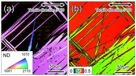 (a) Crystal orientation distribution map highlighting only the inside of the twin boundary and (b) SF map of prism dislocation slip for the tensile direction in Ti-210 deformed 14% at high strain rates (100 s−1).