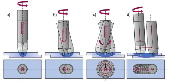 FSW and its modifications after [,]. (a) FSSW; (b) Swing-FSW; (c) Swing-FSW with a gyroidal movement; (d) Stitch-FSW.