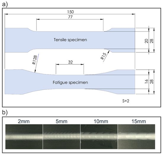 (a) Specimen geometry for tensile and fatigue testing according to DIN EN ISO 6892-1 and ASTM E466-15 [,] with all dimensions in millimeter.; (b) welded intersecting friction stitch welds with weld lengths between 2 mm and 15 mm.