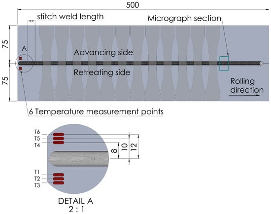 Welding was performed on an FSW machine by ESAB which can perform friction stir welds with an axial force up to 25 kN and a maximum feed speed of 4000 mm/min on one linear axis. To produce a friction stitch weld, a respective traverse length of the machine was set. After welding the first weld, the starting point was adjusted by adding the stitch length so that the plunging point of the following weld was located in the center of the exit hole of the previous weld. These intersecting friction stitch welds were repeated over the entire length of the workpieces (500 mm). For each welding pass, the stitch weld length was varied in steps of 2, 5, 10 and 15 mm. This resulted in a linear weld consisting of many intersecting stitch welds, as shown in Figure 3. The welding parameters shown in Table 2 were determined experimentally, and it was possible to achieve joints without any visible surface defects. A conventional friction stir weld, here referred to as standard FSW, was performed with the same parameter set for comparison. The FSW seam was oriented in the rolling direction of the aluminum sheets. During the welding process, the temperature was measured at six points near the starting point as seen in Figure 4 using K type thermocouples. The thermocouples were placed in a distance of 8, 10 and 12 mm, respectively, to the joint line.