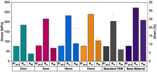 The tensile properties of the standard FSW show highly decreased strength properties with high standard deviations compared to the other welded specimens and the base material, indicating an imperfect weld. These flaws are showed in Figure 6 in the form of periodic tunnel defects at the bottom of the weld.