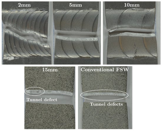 The standard FSW has an almost uniform hardness distribution, which is in accordance with investigations by Sato and Rodrigues on friction stir welded AlMgSi alloys in the T4 heat treatment condition [,]. The softened zone at the bottom of the standard FSW aand the 15 mm stitch weld is due to a tunnel defect, which can be seen on the fractured tensile specimen in Figure 9.