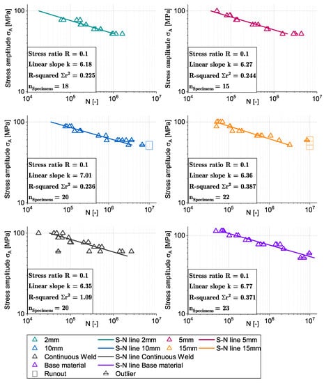 Figure 7 shows the experimental results and normalized S-N lines of the fatigue tests. The point plots represent the fatigue life of the respective weld specimens at different stress amplitudes. Outliers are defined as those specimens that failed in the clamping zone. These are marked in the diagrams and crossed out.