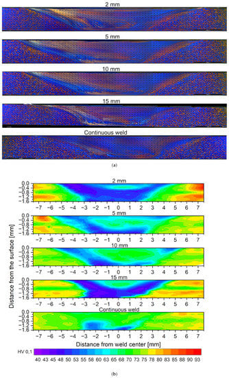Results of the microscopic investigation and the hardness measurements. (a) crosssections of the stitch welds etched with Barker’s etchant and photographed under polarized light; (b) HV0,1 Hardness map of the cross sections of the stitch welds and the continuous weld.