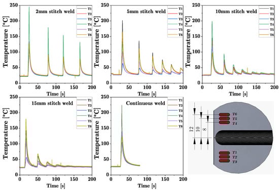 Thermocouple signals of all stitch welds in comparison to the continuous FSW and the positions of the thermocouples to the weld (all dimensions in millimeter).