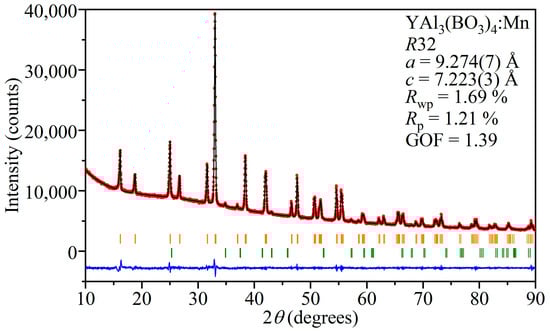 Powder X-ray diffraction on the grown crystals at room temperature was performed on a Thermo Fisher Scientific ARL X’tra diffractometer (Basel, Switzerland) equipped with a Dectris MYTHEN2 R 1D detector (Cu Kα1,2 radiation). The operational voltage and current were 40 kV and 40 mA, respectively. Powder diffraction patterns were obtained in continuous mode at a rate of 2°/min in Bragg–Brentano geometry over an angle range of 10° ≤ 2θ ≤ 90°. The unit cell parameters of YAl3(BO3)4:Mn were refined by the Le Bail method using the JANA2006 program [30]. All parameters were refined by the least-squares method. The pseudo-Voigt function was used as the peak profile function. The structural data for YAl3(BO3)4 (sp. gr. R32, a = 9.295(3) Å, c = 7.243(2) Å, α = β = 90°, γ = 120°) were used as the initial structural parameters [31].