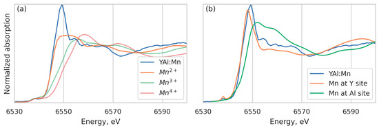 K-edge absorption spectra of Mn in YAB:Mn compared with the “reference” Mn2+, Mn3+, and Mn4+ spectra (a); calculated XANES spectra for Mn at the Y3+ and Al3+ sites in YAB crystal structure compared with experimental spectrum (b).