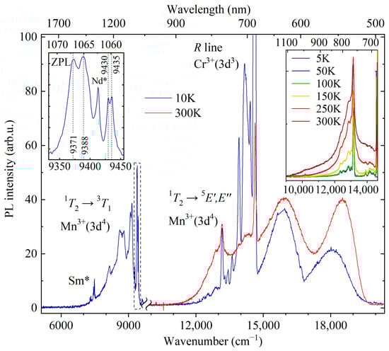 PL spectrum of YAB:Mn in a broad spectral range. The break separates the parts of the spectrum recorded on the Bruker IFS HR125 spectrometer (5100–9900 cm−1 at 10 K, λex = 450 nm) and on the OceanInside HDX spectrometer (9900–20,500 cm−1 at 10 and 300 K, λex = 488 nm). The left inset shows the region of zero-phonon lines in an enlarged scale. The right inset presents the region around the line 13,160 cm−1 at different temperatures (5–300 K, Bruker IFS HR125 spectrometer). The lines due to uncontrolled Sm3+ and Nd3+ impurities are marked as Sm* and Nd*, respectively.