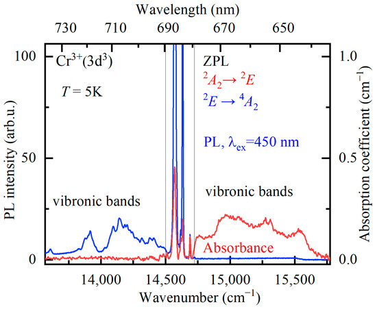 A strong relatively narrow peak at about 685 nm is observed in the room-temperature low-resolution PL spectrum. Previously, three narrow peaks with maxima at 682, 684, and 686 nm were reported in the room-temperature luminescence spectrum of YAB:Mn, and two of them were attributed to the R1 and R2 lines of Mn4+ [27]. The Mn4+ ion has the same valence electron shell structure as Cr3+(d3). Narrow R lines in the spectra of d3 ions arise due to spin-forbidden transitions from the excited orbital doublet 2E to the ground orbital singlet 4A2. In a low-symmetry crystal field, the 2E level, which is doubly degenerate in the cubic crystal field approximation, splits into two components, so that the R1 and R2 lines can be observed. We were able to observe peaks at the same wavelengths as in [27], both in the luminescence and absorption room-temperature spectra. However, a more detailed study of the temperature-dependent absorption, PL, and PL excitation spectra led us to the conclusion that those are R lines of uncontrolled Cr3+ impurity. Figure 6, Figure 7 and Figure 8 display these spectra.