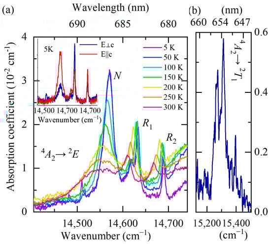 Unpolarized absorption spectra of YAB:Mn at different temperatures in the spectral range of zero-phonon R lines. The inset shows the spectra at T = 5 K for two polarization directions of the incident light: E||c (red trace) and E⊥c (blue trace) (a). Absorption spectrum at T = 5 K in the region of the 4A2 → 2T1 transition (b).