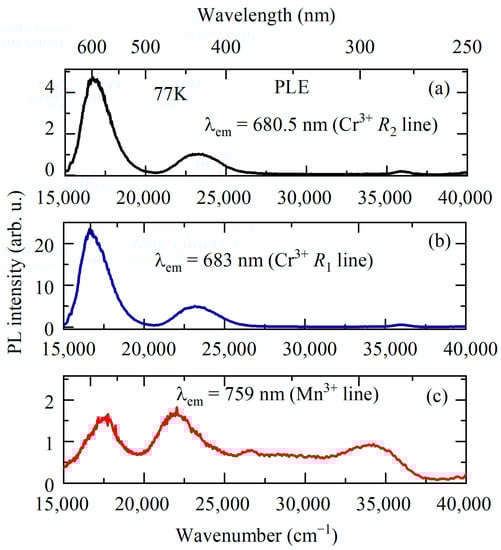 One more relatively narrow (~80 cm−1) line associated with manganese is observed in the red part of the low-temperature spectrum at 13,160 cm−1 (759 nm) (see Figure 5). It is accompanied by a Stokes vibronic sideband which grows in intensity with rising temperature; simultaneously, an anti-Stokes part appears (see, e.g., [48]). We tentatively assign this line to a transition from the excited orbital triplet 1T2 to the ground Jahn–Teller-split doublet 5E′, 5E″ in Mn3+ [23]. A similar transition (though not as rich in structure) with a peak at 13,700 cm−1 was observed in the low-temperature emission spectrum of Y3Al5O12 (YAG) doped with Mn3+ [20]. The excitation spectrum of the PL line 759 nm is presented in Figure 8c. It shows four bands peaking at 17,450, 22,000, 26,750, and 34,326 cm−1. Bands at 17,450 and 22,000 cm−1 can be related to the spin-allowed transition from the 5E ground state to the excited 5T2 triplet of Mn3+, split by the low-symmetry crystal field, whereas the bands at 26,750 and 34,326 cm−1 are apparently associated with the Mn3+ transitions to the higher-lying states (3E, 3T1) [23].