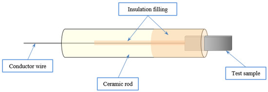 Electrochemical impedance spectroscopy (EIS) allows observing the corrosion of the coated P91 samples in contact with the molten binary salt during 2000 h. For this purpose, points of the coated P91 sample were electrically connected by welding to a Kanthal wire. This joint was protected by the application of a ceramic slurry mixture. The wire was introduced in an alumina tube sealed with the same ceramic mixture avoiding contact between the sample–wire connection and the molten salts (Figure 1). The EIS uses the working electrode (WE), the auxiliary electrode (AE) and the reference electrode (RE) (patent reference code WO2017046427).