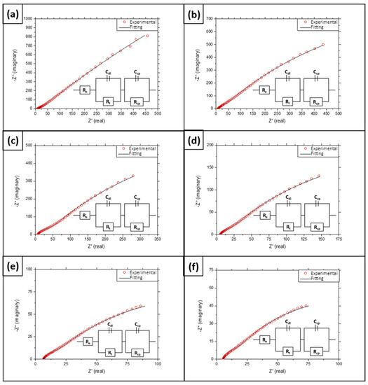 Impedance spectra of the coated P91 samples tested at 500 °C in Solar Salt at (a) 24 h; (b) 72 h; (c) 500 h; (d) 1000 h; (e) 1500 h; and (f) 2000 h.