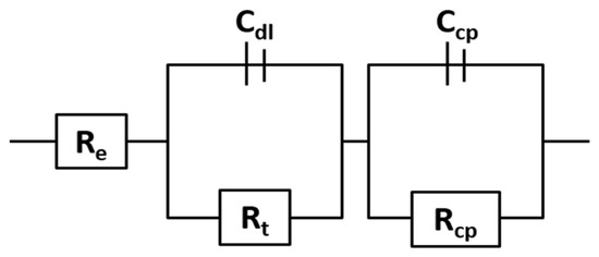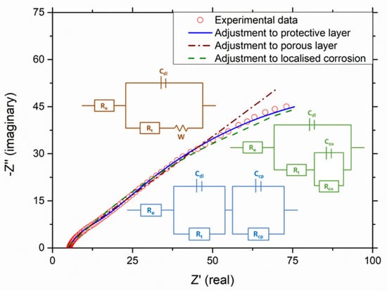The protective layer model indicates that ion transport in the layer is the stage that limits the process and slows down the corrosion process. From a physicochemical point of view, the layer resembles a capacitor in series with the double-layer capacitance (see Figure 4). Thus, Ccp and Rcp respectively represent the protective layer capacitance and its resistance to the charged particles transfer. By way of example, Figure 5 shows the adjustment made after 2000 h of testing, including the models for a protective layer, localized corrosion and porous layer.