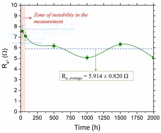 Table 2 contains the values of each of the equivalent circuit elements in compliance with each testing time with the protective layer model. According to the obtained results and as shown in Figure 6, the resistance of the electrolyte (Re) (i.e., the electrical resistance of the molten salt) remains roughly constant in a range of between 5.051 Ω and 7.557 Ω. However, the resistance peak of 7.557 Ω obtained after 24 h of the test is attributed to the instability of the system during the initial stages. This instability is also visible when observing the remaining parameters. Thus, without considering the values obtained during the stability period (first 72 h of testing), it may be affirmed that the molten salt resistance has an average value of 5.914 ± 0.820 Ω. This value differs from that obtained in other studies [33,50,51], which may be due to the coating material that was detached during the initial stages of the test [28]. ZrO2 is a semiconductor material and leads to an increase in molten salt electrical resistance [50]. Additionally, the presence of coating components in the salt and the formation of volatiles throughout the test led to a reduction in ionic species concentration and, therefore, a reduction in electrolyte conductivity. The effect of the system on the Re value seems to be evident according to the dissimilar values found in those works cited [33,50,51].
