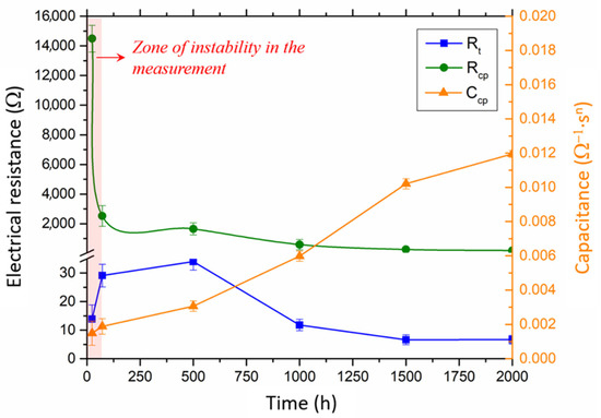 This difference implies that the corrosion process is controlled by the transport of charged particles moving through the protective layer since it is the slower process [50]. This fact is indicative of the good behaviour of the coating. In addition, it is important to highlight the significant reduction in time in both parameters. The decrease in both resistances reveals that the transference of charges and charged particles is eased so the kinetic of the degradation processes can be accelerated. This, together with the increase in Ccp (see Figure 7), may be due to the degradation of the coating over time. However, after 1000 h of testing, the system seems to be more stable, leading to slower degradation.