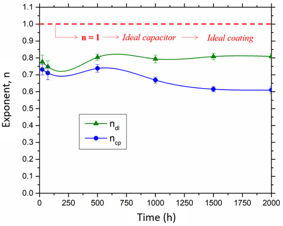 Finally, with regard to the exponents ndl and ncp, they remained constant during the entire test and remained below 1 (see Figure 8). These two exponents show a value of 0.79 ± 0.02 and 0.68 ± 0.06, respectively. According to Omar et al. [52], an n value equal to 1 indicates that the system acts as an ideal capacitor, which would be the closest to an ideal coating.
