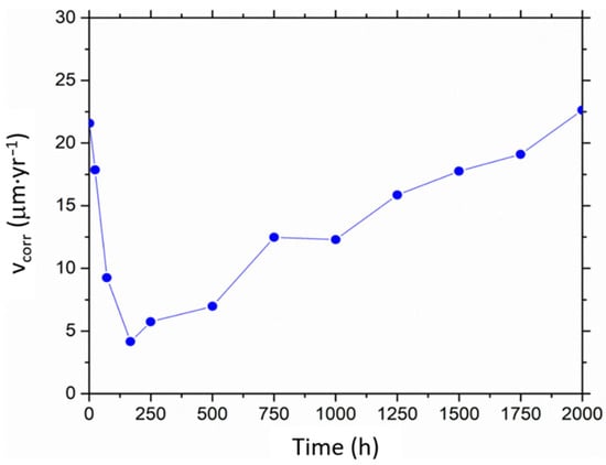 Furthermore, and considering the corrosion rates estimated at each testing time (see Figure 9), the initial stabilisation period is clearly observed (0–72 h), as well as the good behaviour of the coating during the intermediate periods (72–1000 h). Within the intermediate times, the corrosion rate remains within the range recommended by the industry for this material in long-term tests (see Table 3 [55]). However, the increase in the corrosion rate after 1000 h of testing is worth noting. Even though the protective properties of the coating are still suitable after 2000 h of testing (according to the EIS spectra), the coating is steadily degraded.