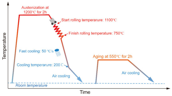 Schematic illustration of the TMCP and aging process for the experimental steel.