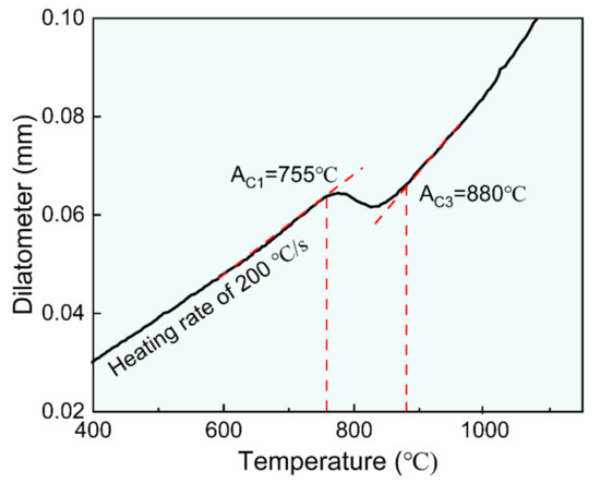 The experimental steel was melted in a 150 kg vacuum induction melting furnace and cast into an alloy ingot. The cast ingot was austenitized at 1200 °C for 2 h and then was hot rolled with 45% reduction at ~1150 °C and 78% reduction at ~750 °C to a final thickness of 12 mm by using a Φ450 mm two high rolling mill. After rolling, the plates were immediately cooled to 200 °C controlled by a water cooling spray cooling system with a cooling rate of ~50 °C/s, as shown in Figure 1. Based on our previous studies [6], aging at 550 °C for 2 h can provide a significant precipitation enhancement of strength. Thus, experimental steels were aged at 550 °C for 2 h, followed by air cooling to prepare the base material (BM). Table 1 lists the chemical composition obtained by spectroscopic analysis using DT-100 instruments. According to Graville et al. equation [20], the carbon equivalent of experimental steel is 0.295%, indicating suitable weldability. Figure 2 shows that the critical austenitization start temperature (AC1) and finish temperatures (AC3) of the experimental steel were estimated at 755 ± 10 °C and 880 ± 10 °C, respectively.