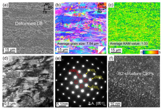 The microstructure of base material is a lamellar structure composed of deformed lath bainite (LB) (Figure 3a,b). The average grain size is ~7.54 μm. Figure 3c displays the gradient of the kernel average misorientation (KAM) value, which characterizes the local dislocation gradient. Figure 3d shows many dislocation tangles at the intersection of the bainite laths. The average size of bainite laths is ~290 nm. Selected area electron diffraction (SAED) along the [001]α direction shows weak (100)-type superlattice reflections (Figure 3e), which are confirmed to be derived from B2 structure precipitates [12,21]. These B2 CRPs are coherent with the α-Fe matrix; therefore, they are difficult to directly observe in bright field micrography. The dark field (Figure 3c) morphology taken from the (010)B2 reflection exhibits nanoscale B2 CRPs precipitated in the experimental steel (Figure 3f).
