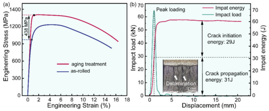 Figure 4 shows the results of tensile and impact tests. The yield strength is calculated by stress at 0.02% strain. The yield strength of as-rolled steel reaches 932 ± 7 MPa. After aging treatment, the yield strength increases to 1370 ± 7 MPa. The effect of B2 CRPs as impediments of dislocation movements results in a significant enhancement of yield strength (~438 MPa). It is noted that a high elongation (~16.5%) is still obtained after aging treatment. This is because B2 coherent CRPs allow dislocations to shear through rather than acting as an impenetrable barrier to dislocation motion [21,22,23]. Due to delamination activated by the lamellar microstructure, low-temperature toughness at −40 °C is ~60 J, as presented in the insert of Figure 4b. In conclusion, a satisfactory combination of strength, ductility, and toughness is achieved in Cu-bearing UHS steel with a lamellar structure.