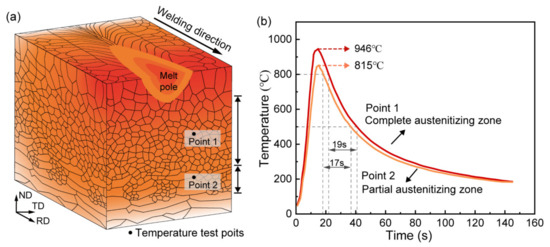 (a) Schematic illustration of the welding process and (b) thermal cycling curves of different HAZ subregions.