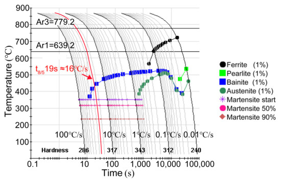 CCT diagram of the investigated steel calculated by the JMatPro database.