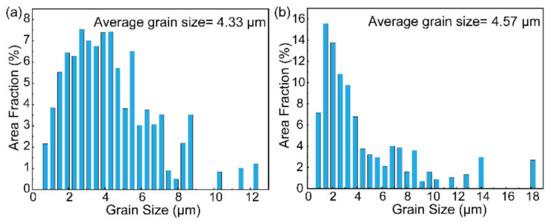 Figure 8 shows the grain size distribution obtained from EBSD results. In the complete austenitizing zone, the large deformed LB grains (7.54 μm) are fully transformed into fine grains (~4.33 μm), presented in Figure 8a. In the partial austenitizing zone, the average grain size is ~4.57 μm (Figure 8b). There are nearly 50% of grains with a size smaller than 4 μm caused by the formation of fine FM. The deformed microstructure has a larger deformation and stores energy, which can provide more nucleation driving force. Consequently, faster and more nucleation of fresh grains results in grain refinement. In comparison, when the initial microstructure is without deformed, only a slight refinement can be obtained by investigating different austenite transformation degrees [25]. Grain refinement aroused by initial lamellar microstructure can be expected to improve the toughness of HAZ.