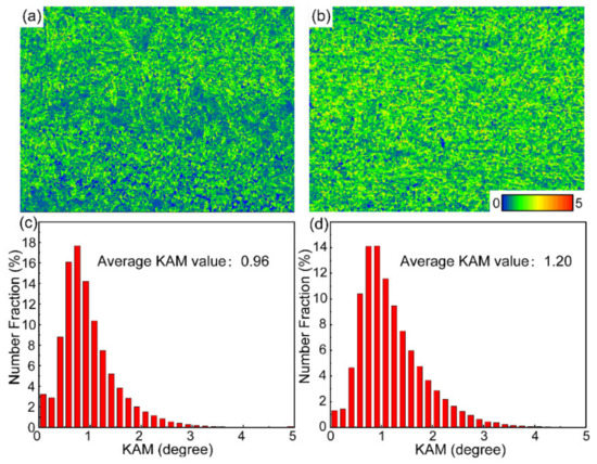 (a,b) KAM maps, 5° exclusion angle, 1st nearest neighbor, (c,d) KAM distribution maps. (a,c) Complete austenitizing zone, and (b,d) partial austenitizing zone in the AW joint.