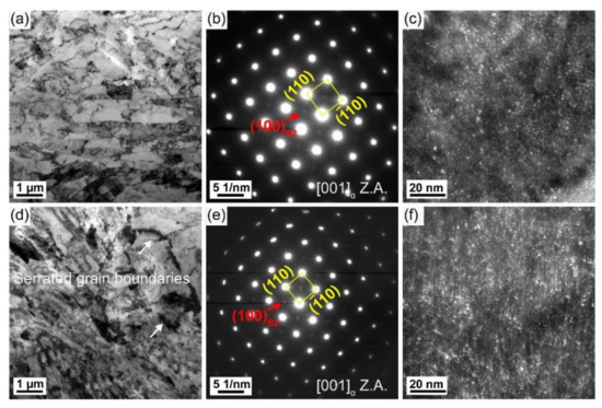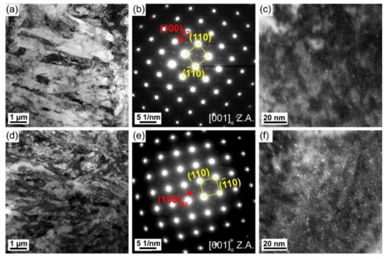 CRP features in (a–c) the complete austenitizing zone and (d,e) the partial austenitizing zone of the AW joint. (a,d) TEM bright field morphology, (b,e) SAED pattern along to [001]α, (c,f) dark field TEM morphology.